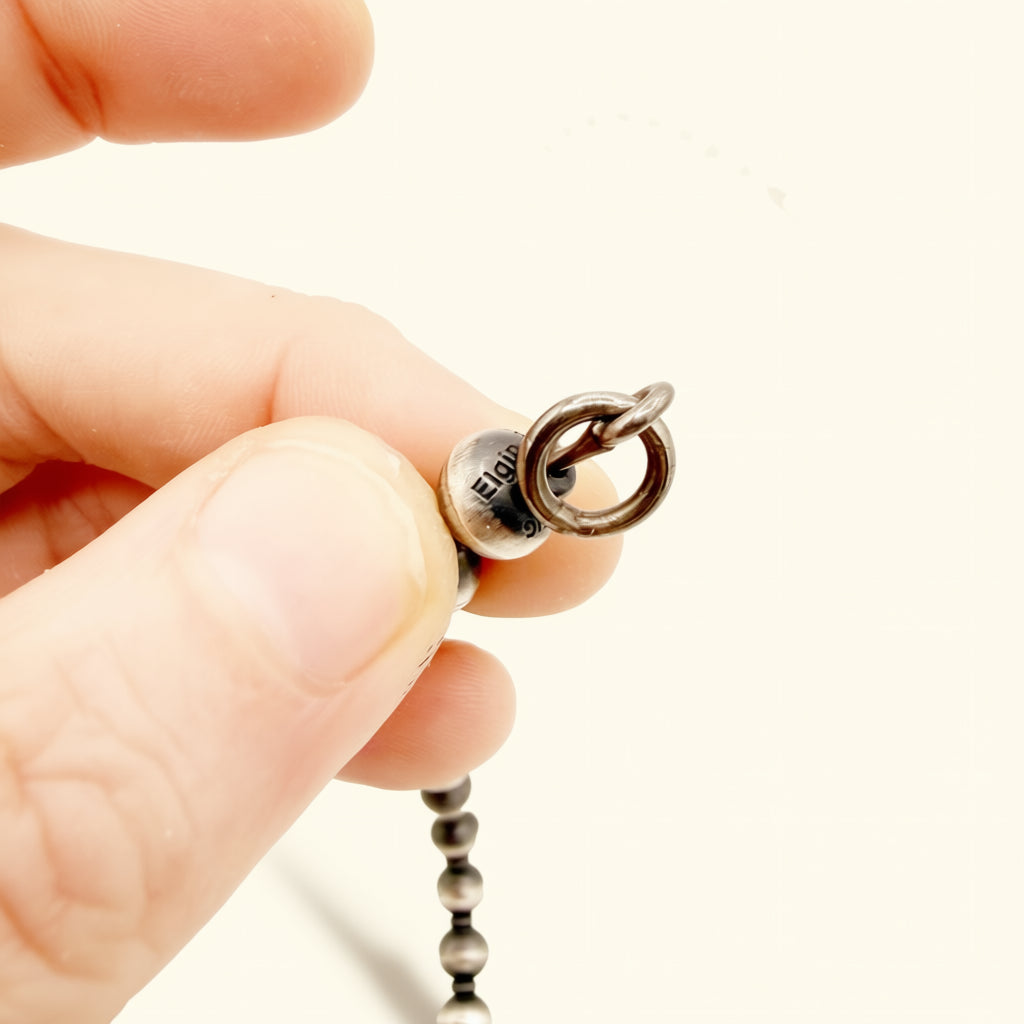 By Elgin Tom, this necklace features hand-strung Navajo pearls crafted in sterling silver. The pearls measure approximately 8mm and are strung along a 20-inch necklace. Designed for everyday versatility, this Navajo pearl necklace layers easily with turquoise pendants or wears effortlessly on its own.