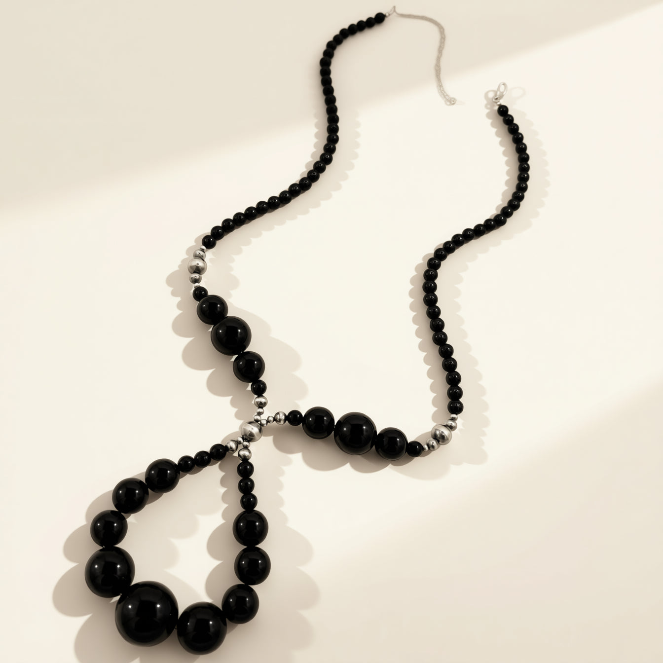 Designed by HJC, this sterling silver necklace features bold Black Onyx beads arranged in a dramatic jocla silhouette. 24 inches with a 4 inch drop, designed to anchor the neckline with sculptural intention.