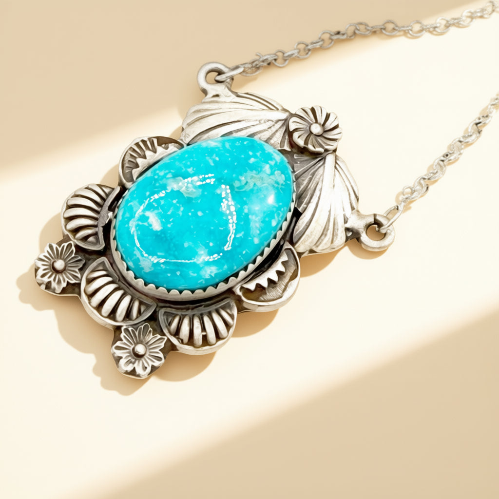 Designed in by HJC, this sterling silver necklace features Sierra Bella Turquoise and is a one of a kind piece!