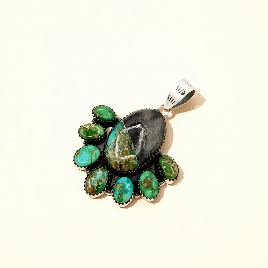 Designed by HJC, this sterling silver pendant features Blackjack turquoise paired with Sonoran Gold turquoise in a classic cluster arrangement.