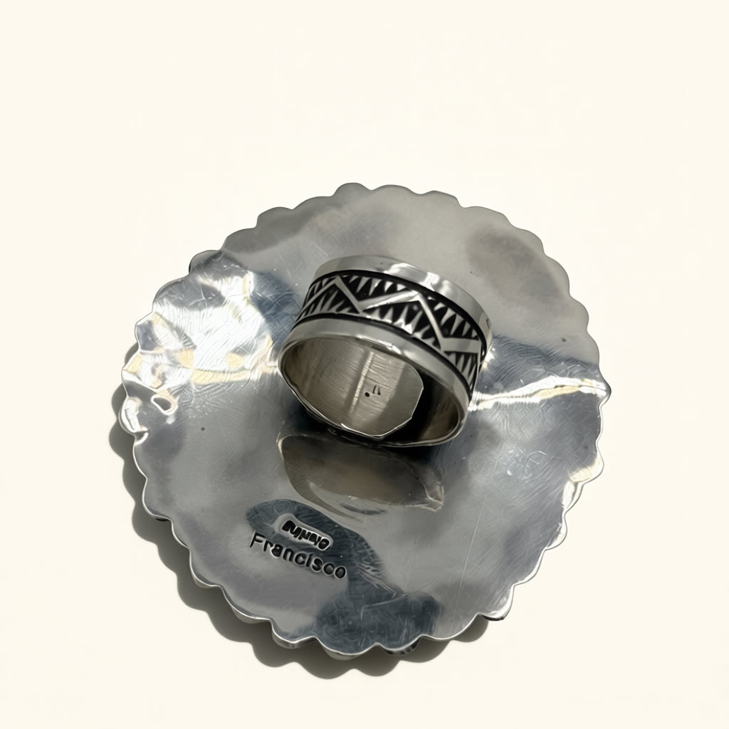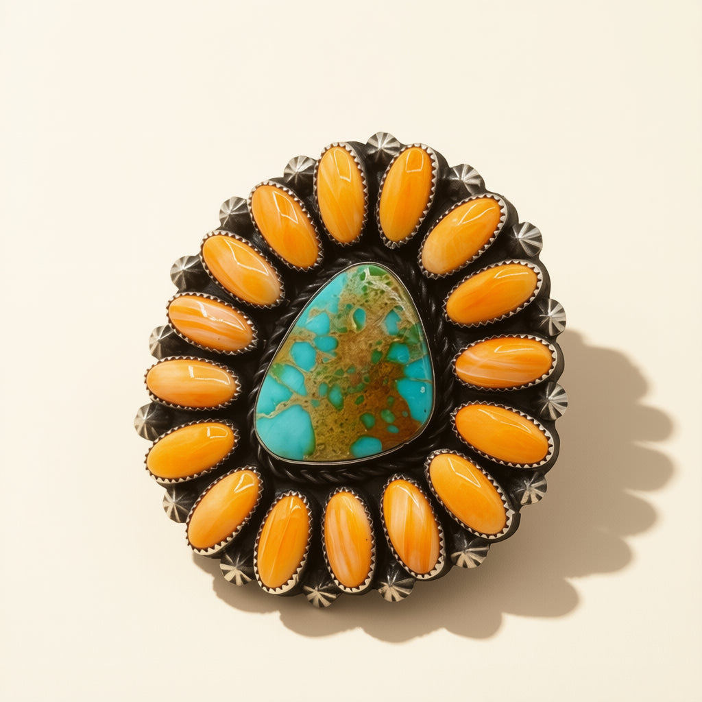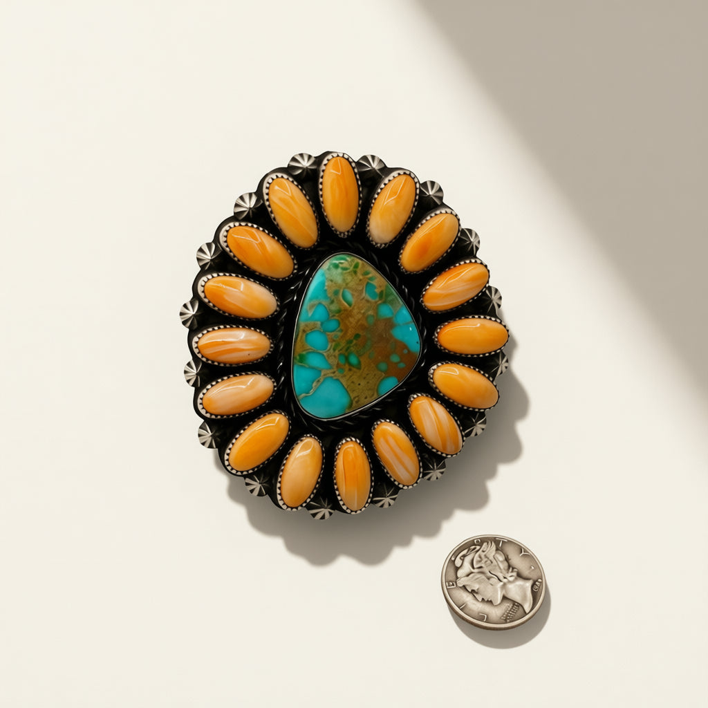 Handcrafted by Dustin Francisco, this ring features Royston and Orange Spiny set in sterling silver and is adjustable.
