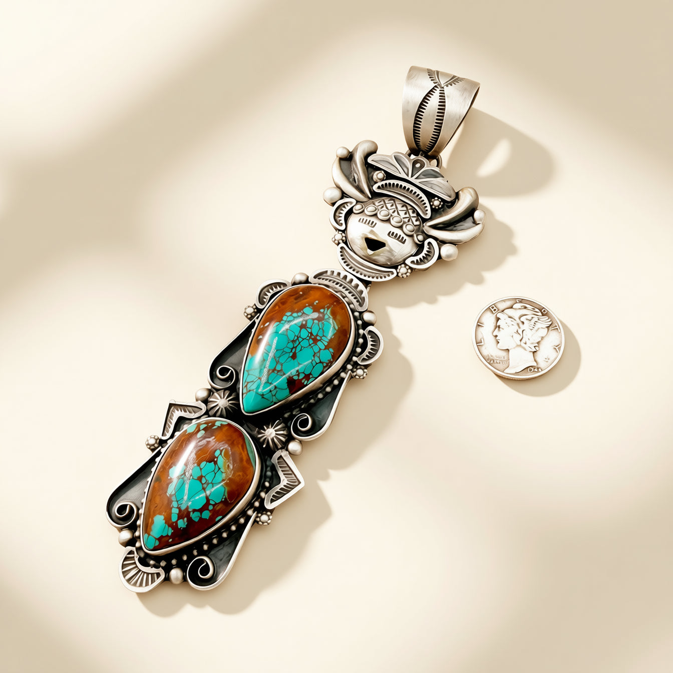 Handcrafted by Ronald Tom, this sterling silver maiden pendant features two vibrant Pilot Mountain Turquoise stones in a vertical silhouette. It is Native made, measures 5 inches, and includes a 12mm bail.