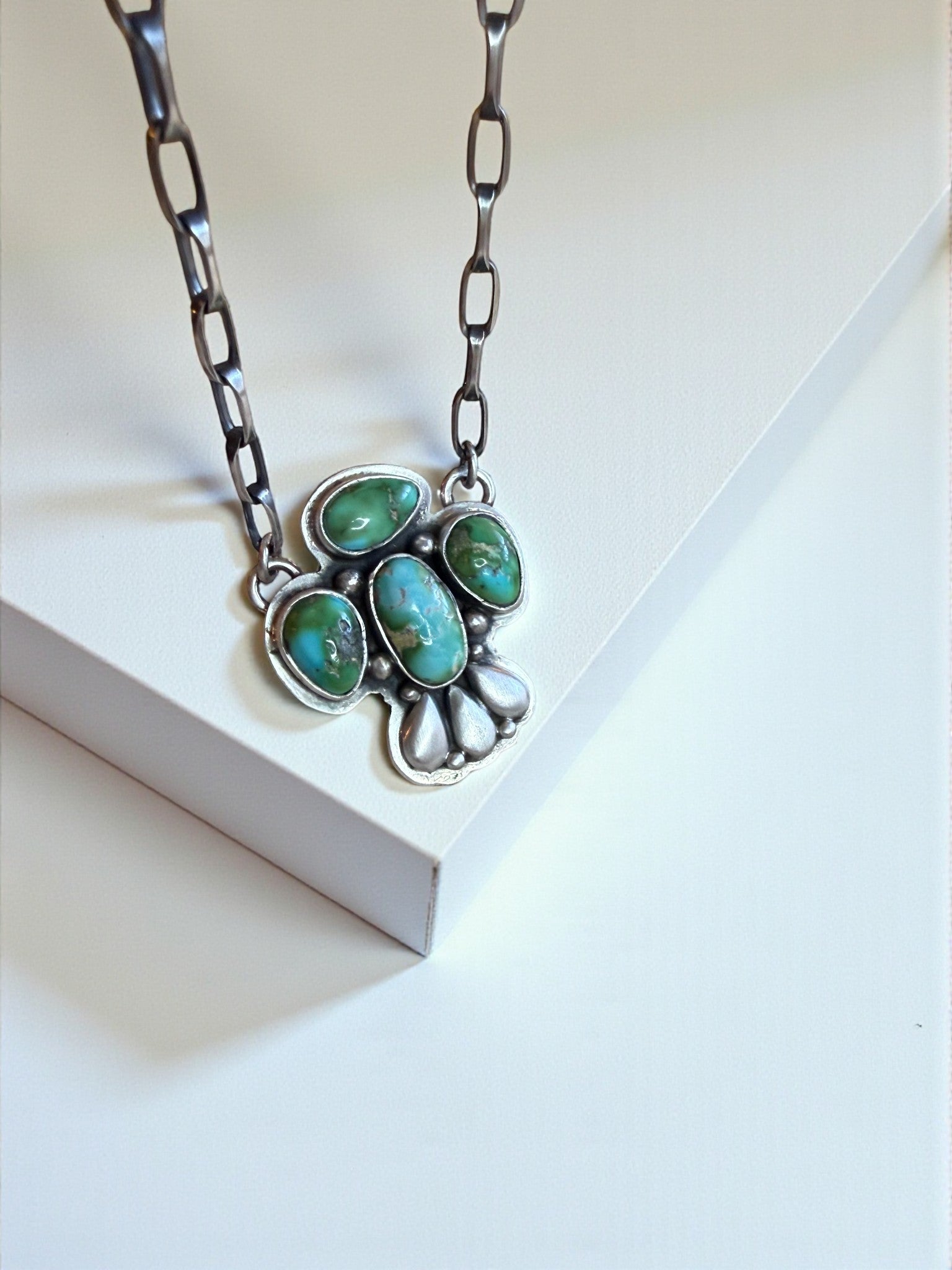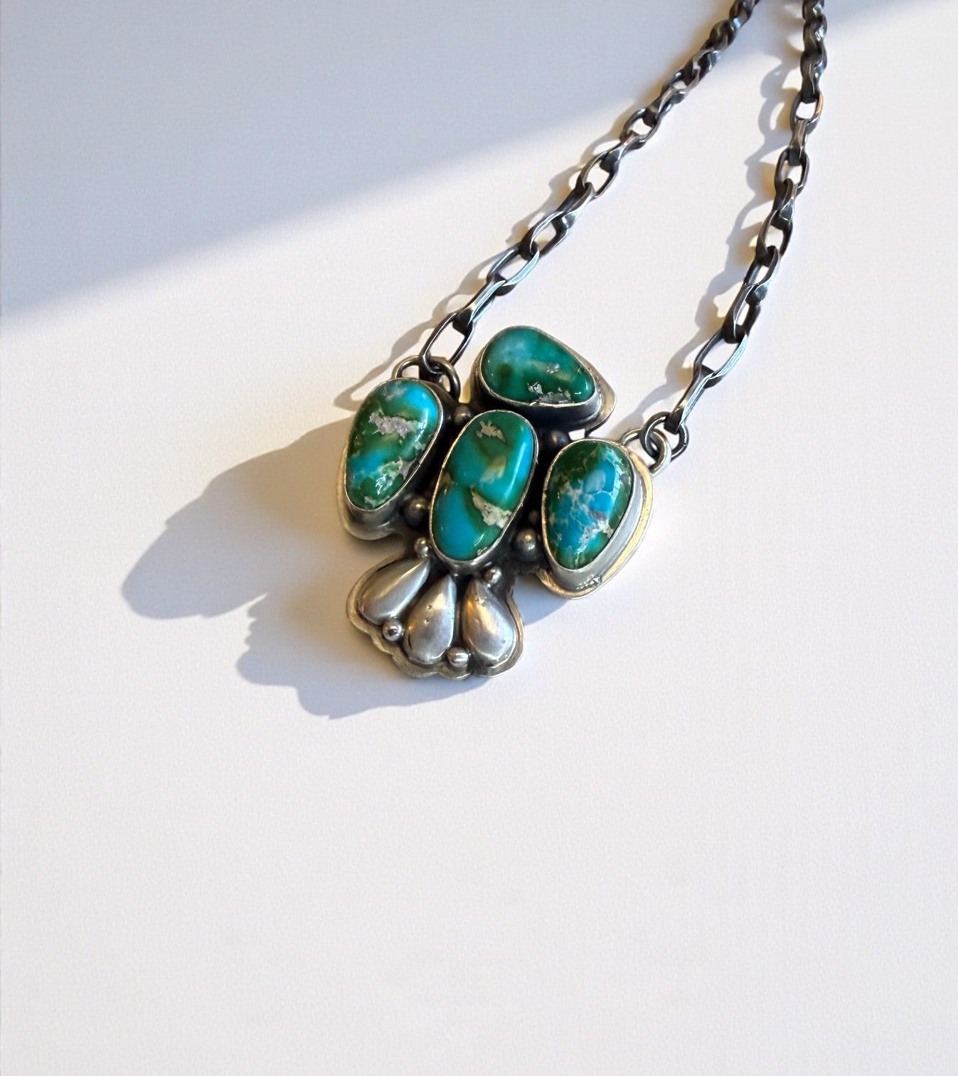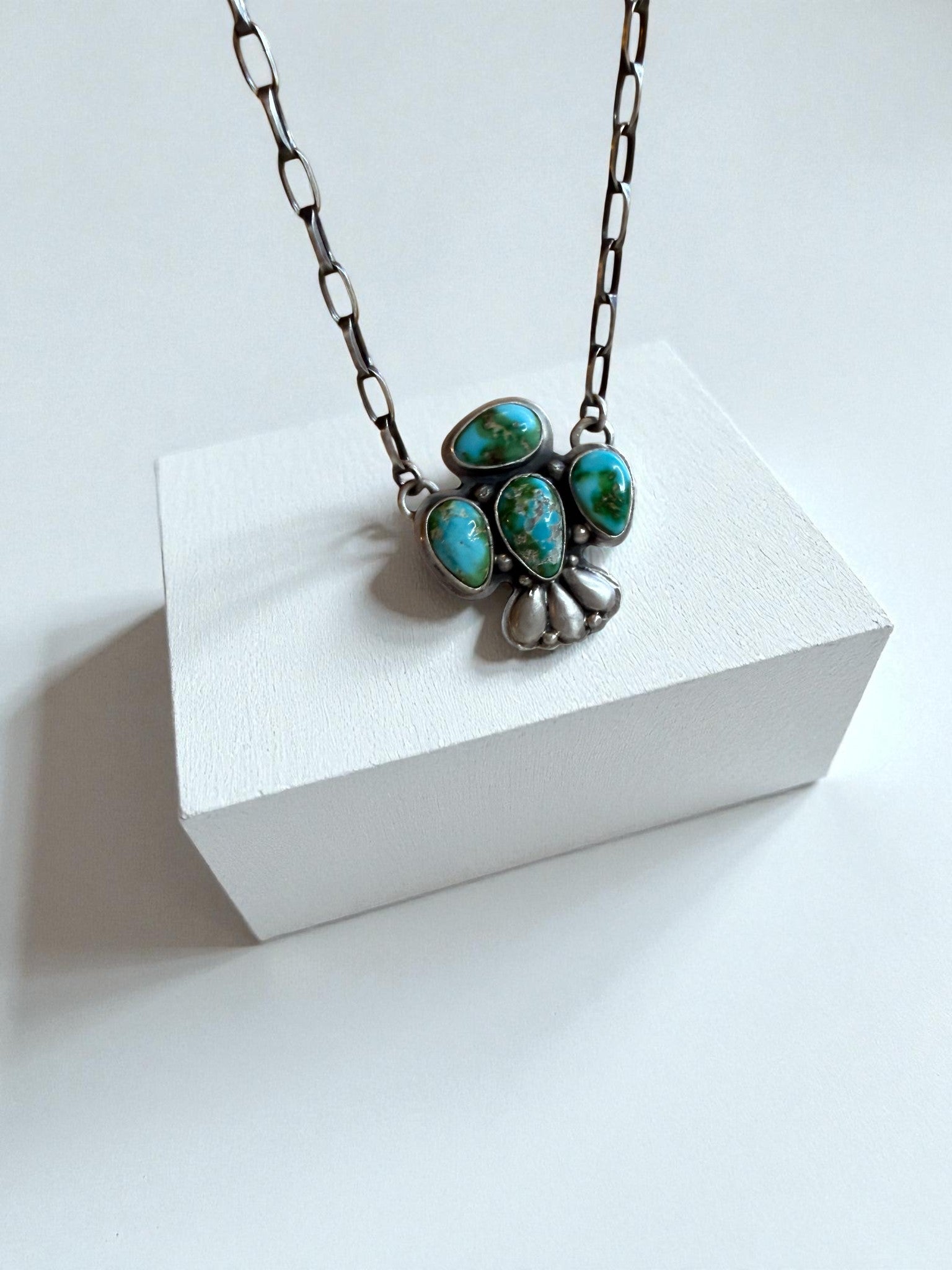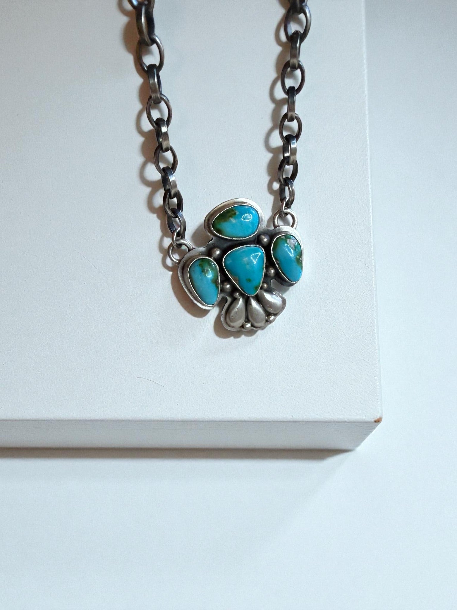 A handmade thunder bird bar necklace by Emer Thompson featuring a cluster of natural turquoise. The silverwork is clean and classic, with smooth bezels, subtle detailing, and a design that sits beautifully on the neckline. Balanced, wearable, and unmistakably handmade.