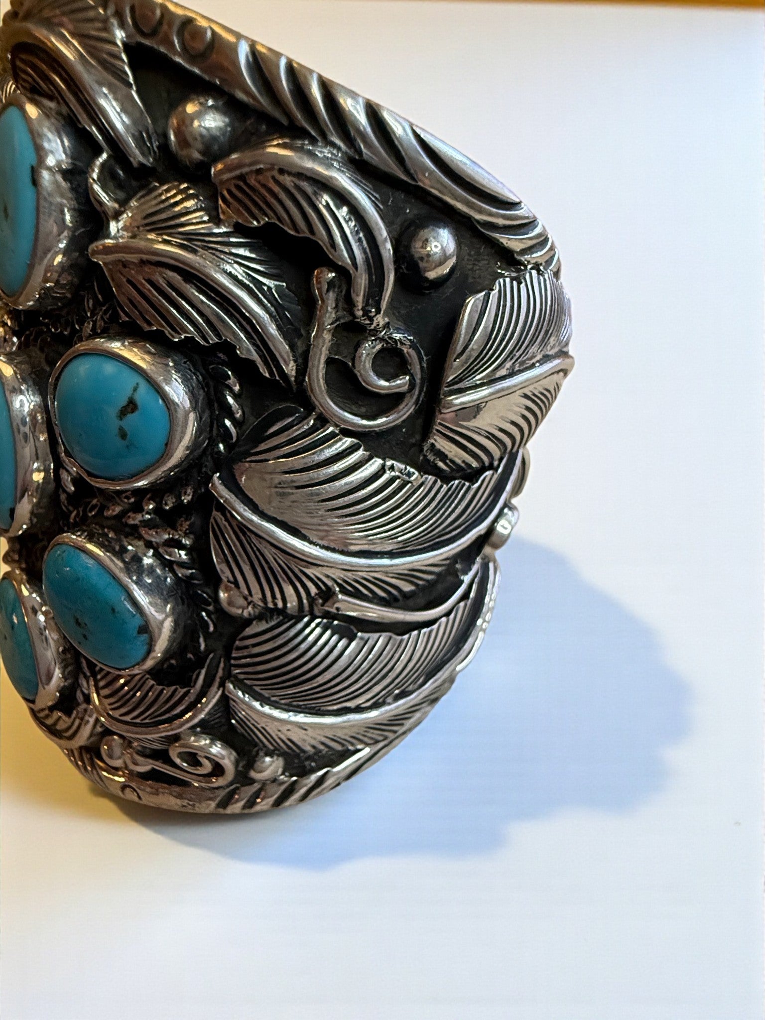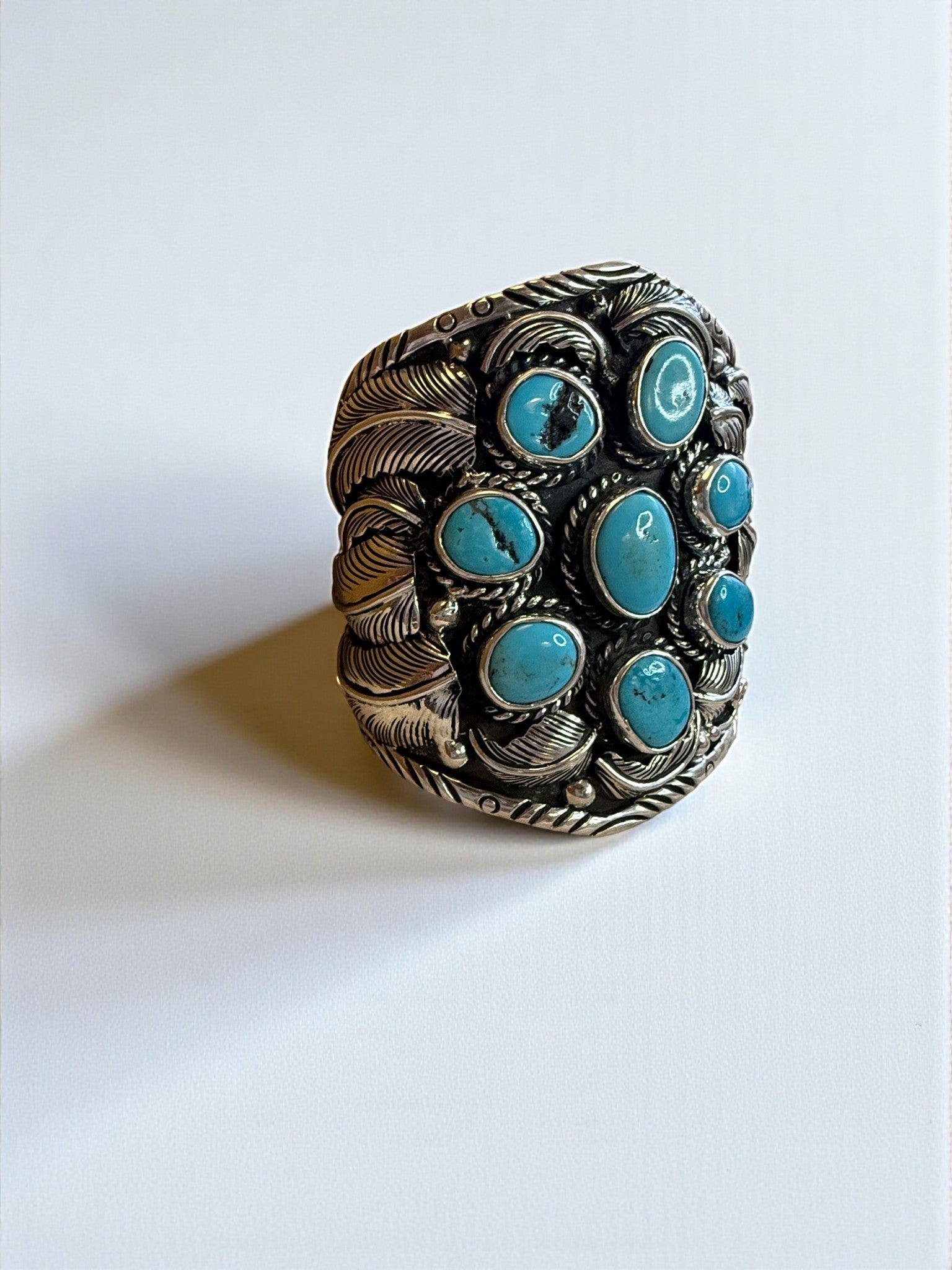A collaboration piece between Jesus Vega and Hespera, built with a cluster of natural turquoise cabochons set in Vega’s signature heavy silverwork. Layered leaves, deep texture, and sculpted detailing give this ring presence from every angle. It’s bold, handmade, and exactly the kind of piece that turns into a signature.