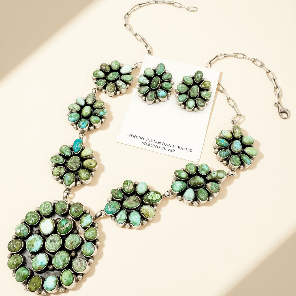 Handcrafted by Sheryl Martinez, this Sonoran Gold turquoise cluster set is finished in sterling silver with a 22 inch necklace and matching cluster earrings measuring 1.25 inches. A masterwork piece.